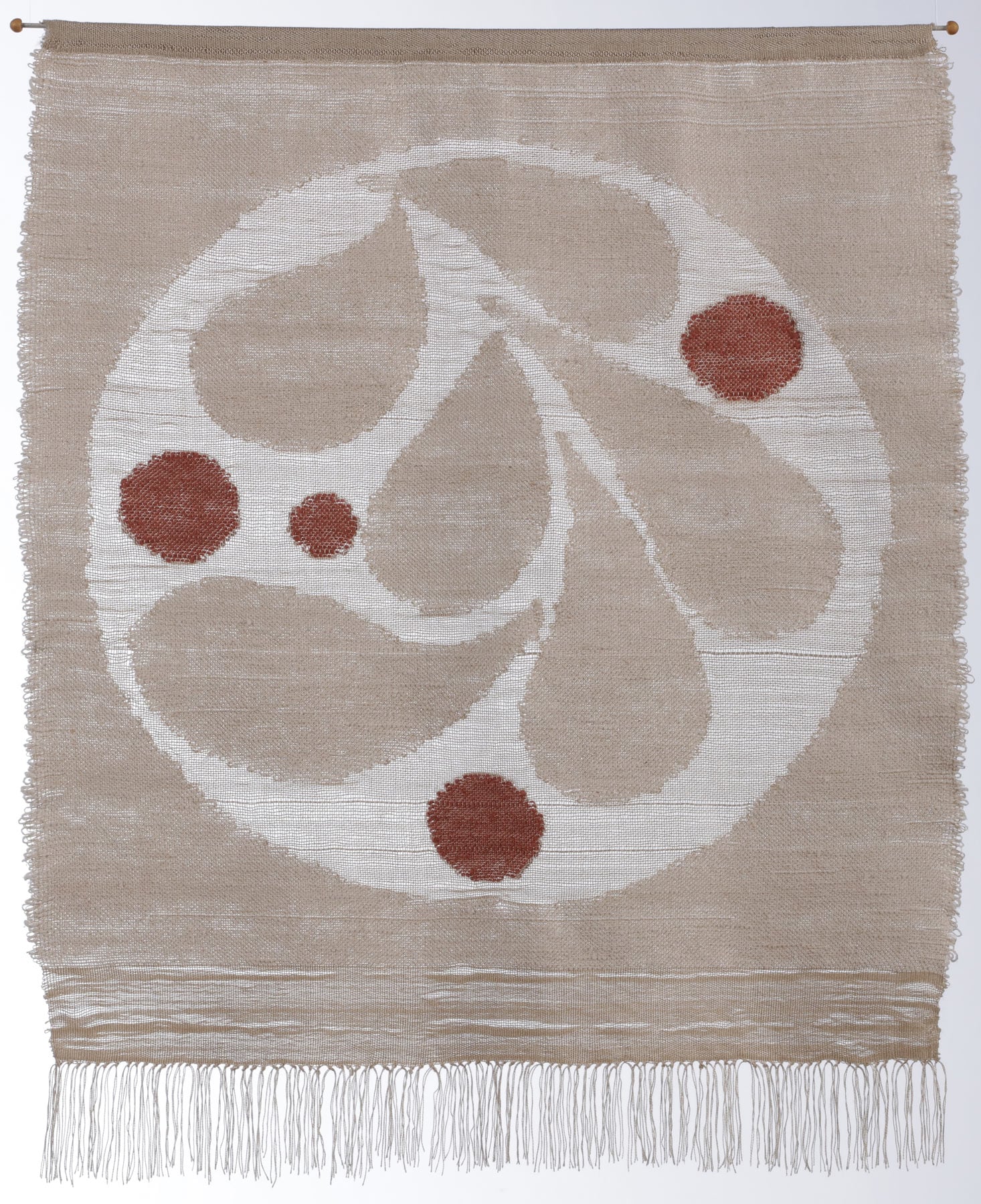 Using silk thread and simple motifs, Christine Meuris has created a series of semitransparent weavings that reflect feelings of harmony, joy, flow, and wholeness. In 2023, Meuris began studying weaving as a way to deepen and ground her creative practice. Studying with weaving teacher Travis Meinolf, at the Richmond Art Center and at his eponymous weaving school in Marin County, Meuris was influenced by Meinolf's judgment-free and open minded approach to weaving, a practice that can otherwise become exacting. After a period of experimentation, Meuris settled on a simple weaving technique — using plain weave with supplemental weft to construct imagery. In her weavings, Meuris returns to the fount of her creativity, the work that steadies her in calm or tumultuous times, repeating simple steps to build something greater than the sum of its parts